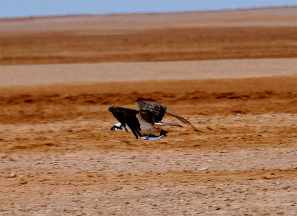 Guardandoci meglio intorno scopriamo che non era sola e il deserto, solo in apparenza desolato, è in realtà pieno di uccelli di tutti i tipi e molte specie di animali. La nostra attenzione va verso un falco pescatore che ha appena catturato un pesce di discreta taglia che trattiene saldamente tra gli artigli.
