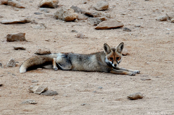 Il deserto è silenzioso e misterioso e guardando bene ci accorgiamo di non essere soli: una volpe ci sta controllando da dovuta distanza. Ci avviciniamo con molta calma e lei si sdraia a poche decine di metri da noi, in posa per qualche scatto. Una volpe del deserto, un animale grazioso e probabilmente più furbo della fama che si porta dietro.