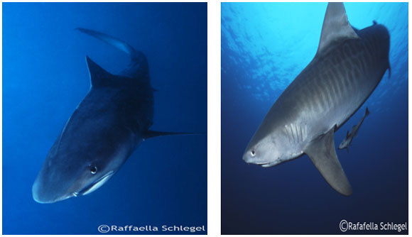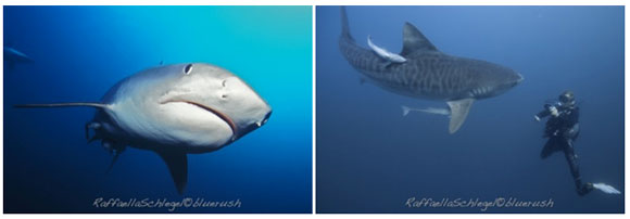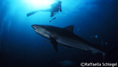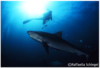 Il cestello è legato ad una fune di circa 7 mt con una grande boa che sarà il punto di riferimento sia per i subacquei in acqua, che disponendosi a semicerchio si faranno trasportare dalla corrente , sia per il gommone e lo skipper. Il tempo per la pastura varia dai 30 ai 60 minuti ma a volte anche di più. Dopo un dettagliato briefing : no pinne gialle, stare calmi, mai perdere di vista il cestello , se lo squalo si avvicina troppo mai girarsi e dargli le spalle, avere con lo squalo tigre sempre il contatto visivo, arriva il grande momento: l’ immersione con sua maestà il tigre, accompagnato da Blacktip (Carcarinhus limbatus), Dusky (Carcarinhus Obscurus) e da una scia di numerose remore.