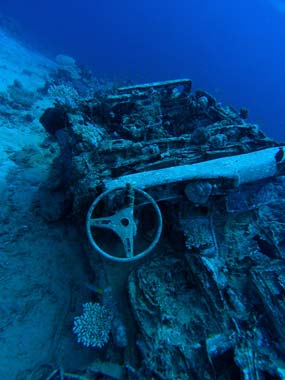 Seguendo la fiancata di destra del relitto in direzione della poppa, si raggiungerà alla quota di 46 metri un passaggio che permette di attraversare la nave da una parte all’altra e soprattutto permette di osservare all’interno delle stive aperte alcune automobili che recano ancora le chiare decalcomanie tipiche dei pick up della casa giapponese.