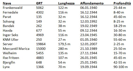 sia esso l’Havda, il Bandak, il Server, il Welheim, il Oldenburg, l’Inger Seks o il posamine appena scoperto KNM Uller alla profondità di 55 metri – l’unico relitto conosciuto per essere stato affondato da idrovolanti norvegesi durante la seconda guerra mondiale. Sparsi sul fondo accanto al bellissimo relitto lungo 27 metri si trovano diverse mine dall’aspetto inquietante, e il suo cannone è