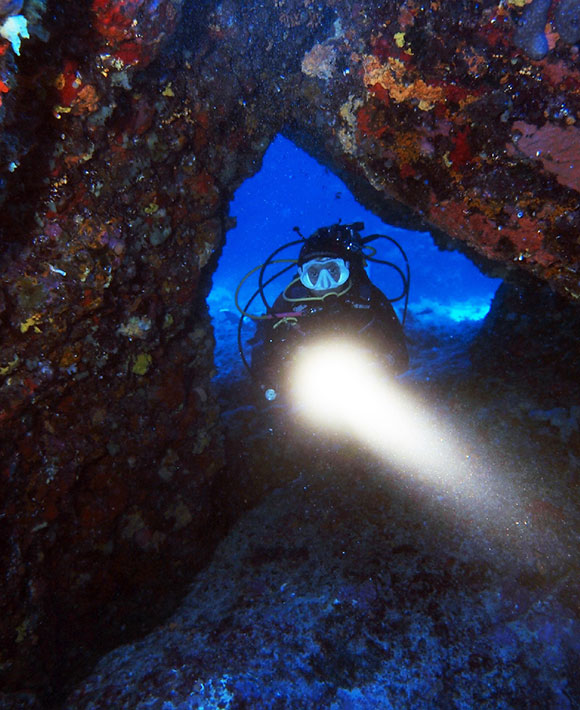 immersione, con grossi pinnacoli, canyons e piccole grotte passanti.