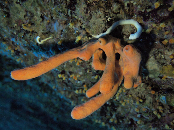 concrezionato di spugne sciafile; nella parte più buia si notano gamberetti allo