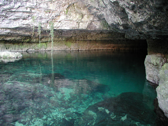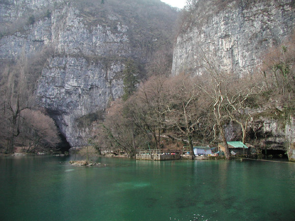Eccoci di fronte a una specie di scalinata offerta dalla natura, larga 15m, che risale comodamente a gradoni per qualche metro e dalla cui sommità, girandomi, vedo le luci dei due inglesi qualche decina di metri dietro di me che illuminano una serie di frastagliate erosioni a balcone esattamente sopra il lago. Da qui la galleria prosegue per un tratto di una trentina di metri sempre mantenendo la larghezza media di 15m e un’altezza di 5m, il fondo è di roccia liscia, il colore è marrone chiaro, le erosioni si sprecano ed ad ogni passaggio, mi diverto a notare ed a far paragoni fra le varie forme che osservo. Oltre questa galleria raggiungiamo una zona molto differente: una frattura taglia di netto la bella condotta, dinanzi a noi si apre un pozzo profondo una decina di metri, in faccia un po’ a sinistra una galleria di 4mX4m colma di fango, lunga qualche decina di metri; sulla destra vediamo una galleria dal diametro di 5m, sopra di noi il soffitto si alza ad almeno 15m.