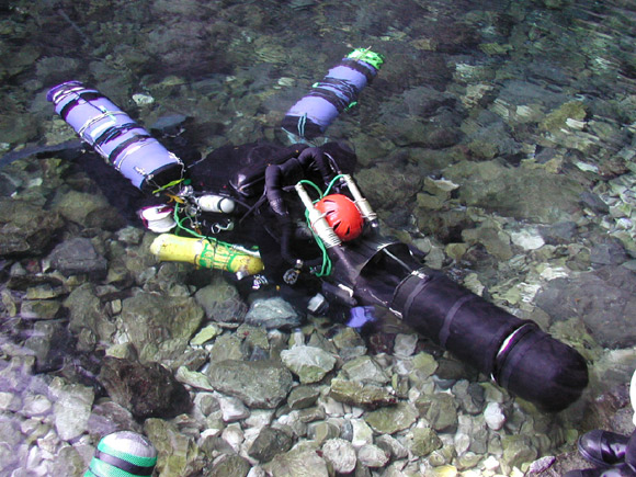 Io scelgo, essendo dotato di un solo circuito chiuso, di mettere nel sifone tre bombole decompressive da 15l, che lascio all’ingresso dello stesso, tre bombole da 20l cariche con miscele respirabili da 0 a -60; due le terrò con me ed una in compagnia di un maialino con 2km di autonomia, la lascerò a 1600-1700m dall’ingresso.