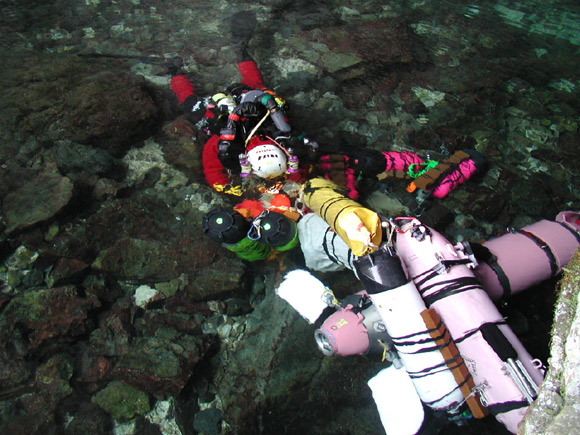 Usciamo dall’acqua, sistemiamo le attrezzature, qualche breve scambio di pareri, considerato il mio inglese maccheronico, e andiamo a preparare il campo base. Le rocce della galleria sono molto scivolose: iniziamo a risalire sui massi fino a raggiungere, la base di una parete alta 4m, sulla nostra destra un limpido laghetto con un diametro di 7m circa. Con una facile arrampicatina risaliamo e percorriamo la galleria che misura 15m di larghezza per un decina di altezza; saltellando tra un masso e l’altro proseguiamo per una ventina di metri in orizzontale prima di iniziare a scendere verso la spiaggetta che ci accoglierà. Sopra di noi si vede una frattura che taglia perpendicolarmente la galleria, il soffitto si alza notevolmente, non meno di 20m. La spiaggetta che ci aspetta non è altro che uno spazio di ghiaia fine di 3X3m posizionato sul lato destro della galleria. Pochi metri prima, da una galleria laterale sulla destra, arriva un ruscelletto la cui acqua ci farà comodo per preparare le zuppe e il thè. Lasciamo i bidoni con i materiali da bivacco, ci spogliamo della muta e dei sottomuta pesanti, io indosso un paio di scarponi e una tuta speleo mentre loro optano per un paio di calzari con suola. Iniziamo a trasportare i materiali da immersione dalla fine del primo sifone al campo base. Dopo aver bevuto un thé, continuiamo a portare a destinazione le attrezzature cioè dal campo base al secondo sifone. Da qui la galleria è molto bella: il fondo è ricoperto di massi per un tratto ma poi, dopo una cinquantina di metri, si arriva ad un laghetto; lo superiamo risalendo sulle rocce qualcuno dal lato sinistro, qualcuno dal lato destro. Oltre il laghetto, sulla sinistra, da una piccola galleria di 2m X 2m che dopo pochi metri si riduce sempre di più, arriva un ruscelletto.