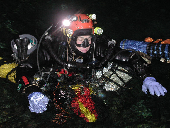 Una lunga dormita e ci svegliamo verso le dieci del mattino, sempre al buio pesto; ho un dolore al ginocchio sinistro, dovuto ai legamenti infiammati da qualche scivolata di troppo durante il trasporto dei materiali. Prepariamo la colazione, il breakfast, poi via, ognuno verso il proprio obbiettivo: i due inglesi al secondo sifone, mentre io zoppicante torno al primo sifone perché voglio andare a vedere alcune gallerie nella zona della congiunzione tra i due sifoni: Siori e Veci. Fortunatamente posso chiudere la muta da solo in tutta semplicità, perché da queste parti non posso contare su nessuno; sistemo le attrezzature e prima di indossare il circuito, verifico i sensori di ossigeno. Tutto in ordine: mi vesto e con una breve pinneggiata raggiungo il maialino e via. Eccomi arrivato al filo che ho steso qualche settimana fa provenendo dai Siori: lo seguo e raggiungo il punto dove ricordo di aver visto una grossa finestra. Come l’altra volta sorprendo un raduno di Protei; scendo dal mio fido propulsore, attacco il filo e inizio a pinneggiare. Dopo una decina di metri vedo di nuovo il filo di Rick e ciò significa che sono ancora nella galleria dei Veci. Recupero tutto e mi porto nei pressi del secondo punto di esplorazione che si rivela una ennesima congiunzione con il sifone dei Veci. Non mi resta altro che rientrare osservando per benino tutte le pareti e non trovando nulla di percorribile. Rientrando, trovo Edoardo, venuto trovarci, che sta finendo la decompressione; riemersi, uno scambio di parole mentre ci spogliamo delle attrezzature, poi andiamo insieme al campo base.