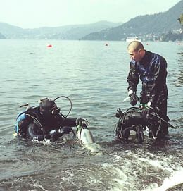Molte delle altre immersioni le ho effettuate successivamente nel lago di Como, ove abbiamo avuto modo di aumentare gradatamente la profondità, con Gabriele sono sceso sino ai -35 metri, poi a -40 ed in seguito a -45, con Renato abbiamo provato l’apparato con le miscele trimix e siamo arrivati ai -70 metri.