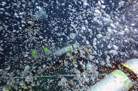Bolle d’aria espulse dai sub in deco