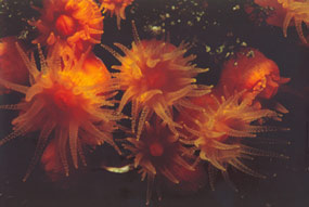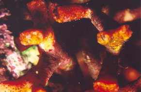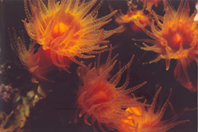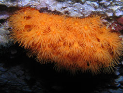 Nei primi metri d’acqua, posizionati su pareti rocciose in ombra, possiamo facilmente individuare la specie Astroides calycularis per il suo intenso colore arancione. Appartenente alla classe Antozoi ordine Madreporari famiglia Dendrofillidi questi coralli formano delle colonie, più o meno sviluppate in grandezza, in luoghi in cui vi sia ombra e forte idrodinamismo. Proprio per il fatto che formano delle colonie incrostanti i calici dei polipi sono uniti sino al margine superiore. Normalmente vivono ad una profondità che oscilla dai primi metri d’acqua fino a 10-15.