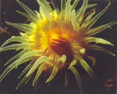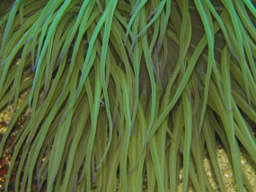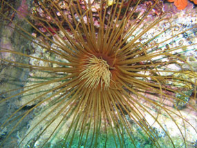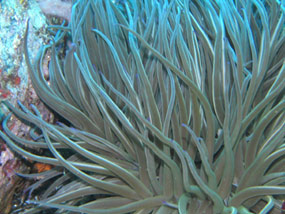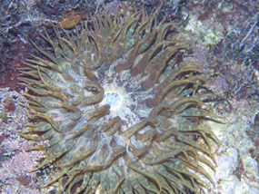 Molto più frequente e conosciuta è la cosiddetta anemone di mare o Anemonia sulcata (classe Antozoi ordine Attiniari famiglia Attinidi). Presente dalla superficie sino a 15-20 metri di profondità, è spesso caratterizzata dall’avere le punte dei tentacoli di colore rosa-violetto. Di notte alla luce della lampada o di giorno in particolari condizioni di luminosità risulta evidente una colorazione superficiale dei tentacoli verde-giallina. Ciò è dovuto alla presenza di alghe simbionti denominate Zooxantelle.