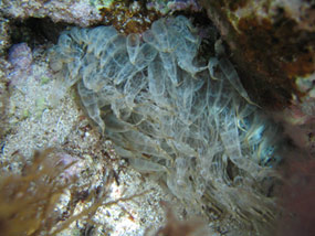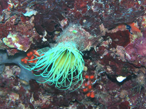 Nei punti in cui si accumula la ghiaia o negli anfratti delle scogliere è possibile incontrare degli esemplari di Cerianthus membranaceus (classe Antozoi ordine Ceriantari famiglia Ceriantidi). Vive tipicamente infossato nella ghiaia o protetto negli anfratti profondi. La sua base è in grado o di inglobare granuli di sabbia e frammenti organogeni oppure di secernere un tubo molle a protezione del corpo. I colori variano dal giallo al marrone al verde-violaceo. Normalmente si incontra a partire dai 10-15 metri di profondità. Quando occupano fondi sabbiosi o ghiaiosi possono formare delle colonie di numerosi individui tutti ravvicinati.