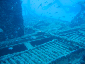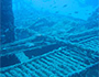 Trovarsi da soli a fluttuare su un relitto è una sensazione unica… Le sovrastrutture ti circondano come le guglie di una cattedrale… le stesse assumono sembianze spettrali quando vengono nascoste da un immenso branco di pesci. Sembra di percepire un suono rimbombare nel vuoto corpo della nave. Il respiro del metallo alimentato dalle correnti. Scalette, oblò, cavi contorti, cabine scoperchiate… contribuiscono ad accrescere la sensazione di paesaggio post atomico. Ogni apertura sembra la tana del Bianconiglio di Alice nel paese delle meraviglie. Sembra offrirti mondi sconosciuti e scoperte meravigliose.