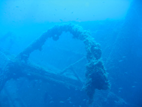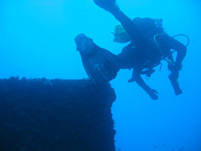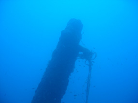 D’improvviso dal blu cominciano a delinearsi le sagome dei castelli centrali e dei pennoni di carico. La sensazione è forte. Il mio primo relitto. Avevamo deciso di seguire la fiancata di babordo sino alla poppa e poi scendere alla zona eliche. A -40 metri mi fermo per ancorare la mia digitale al parapetto, purtroppo lo scafandro che la protegge non regge pressioni superiori. Il tempo necessario ad applicargli una luce strobo, per ritrovarla più facilmente al ritorno, e mi rendo conto di aver perso il resto del gruppo. Poco male, ho ben chiaro il percorso concordato ed i tempi di cui hanno bisogno, decido di fermarmi in quota a scattare qualche foto ed aspettare che gli altri risalgano.