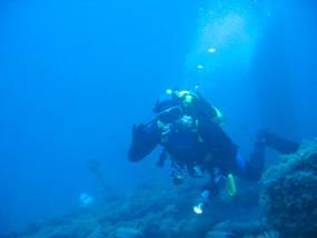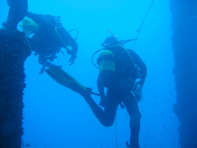 Notiamo subito una forte corrente quasi parallela alla riva, sarà una sfacchinata. Ci prepariamo, iniziamo a montare i gruppi e la bombola di riserva per una eventuale tappa di decompressione. Facciamo un rapido briefing per metterci d’accordo sulla rotta da seguire, su dove trovare la bombola di deco e sul giro da fare sul relitto. Fa parecchio caldo, chi è già pronto entra in acqua ed aspetta gli altri… peccato la corrente… è difficile a questo punto compattare il gruppo, siamo a circa 10 – 15 metri l’uno dall’altro, anche urlando ci si sente appena. Cominciamo la discesa sperando che sul fondo sia minore.