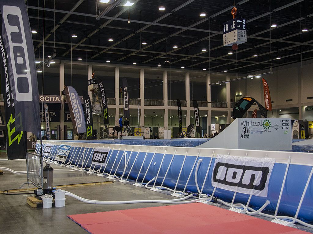 Da buoni subacquei è di nostro maggiore interesse il padiglione 8 dove si sono disposti gli stand degli operatori del mare tra cui anche la subacquea. Al centro del padiglione una piscina olimpionica per le prove e gli spettacoli, con rampe per i salti dei sup e tutto intorno gli spazi espositivi di molti operatori del settore.