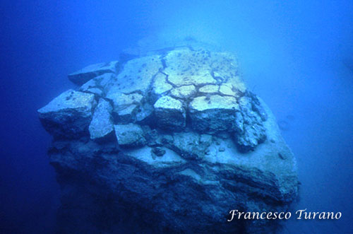 Superata questa zona di bassofondo, si segue il pendio di fine sedimento: presto ha inizio la tipica discesa verso le profondità dello Jonio ma quasi subito, a soli 18 m dalla superficie, un muro di pietra sembra sbarrarci la strada. Il castello di roccia fuoriesce dal fondo e si snoda per una cinquantina di metri parallelo al litorale. Il lato esterno, con una caduta di una decina di metri, offe rifugio a qualche murena, a diversi giovani esemplari di cernia bruna e, soprattutto, cernia dorata, e alle prime popolazioni di castagnole rosa e piccoli saraghi fasciati. Qualche polpo e diverse specie di molluschi nudibranchi si nascondono alla vista degli osservatori superficiali. Già questa parete, che poggia di nuovo sul fondo intorno ai 25 m di profondità, può da sola rappresentare un percorso interessante per una intera immersione. Se invece si vuole esplorare la scogliera più profonda, è necessario passare rapidamente sopra la murata e procedere verso i 40 m di profondità, dove troveremo un altro agglomerato di grandi macigni, il più grande di tutti e anche il più ricco e popolato da una discreta fauna bentonica.