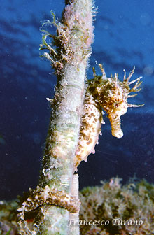Da nord verso sud ci avventuriamo alla scoperta del sesto continente partendo dalla propaggine sabbiosa di Punta Pellaro. Qui, dove la spiaggia si spinge in mare come una lingua protesa verso la maestosa Etna, la Calabria si tuffa negli abissi con vertiginosi pendii spazzati da correnti imprevedibili. Molte le immersioni possibili lungo gli arenili sabbiosi di Pellaro e dintorni, ma due le proposte importanti. La prima prevede di immergersi da terra di fronte a un torrente noto come la Fiumarella; la seconda invece, sempre con ingresso in mare dalla spiaggia, ci porta sul sommo di una secca molto vicina alla riva, che da soli tre metri di profondità sprofonda nel blu con una franata di massi che si diradano intorno ai 65 m di profondità. Quest’ultima è nota ai locali come Secca di Pellaro. Ma torniamo alla foce del torrente Fiumarella, dove c’è una prima scogliera fatta di pietre quadrangolari e molto ampie, sparse tra due e cinque metri di profondità. Sembrano quasi delle mura accatastate sul fondo, tanto che le singole pietre, a uno sguardo dall’alto, sembrano come i pezzi di un puzzle. Il risultato è un vero reef con numerosi rifugi per piccoli pesci e una moltitudine di invertebrati. Un tempo questi scogli erano tappezzati da grandi spirografi e popolati da incantevoli esemplari di cavalluccio marino.