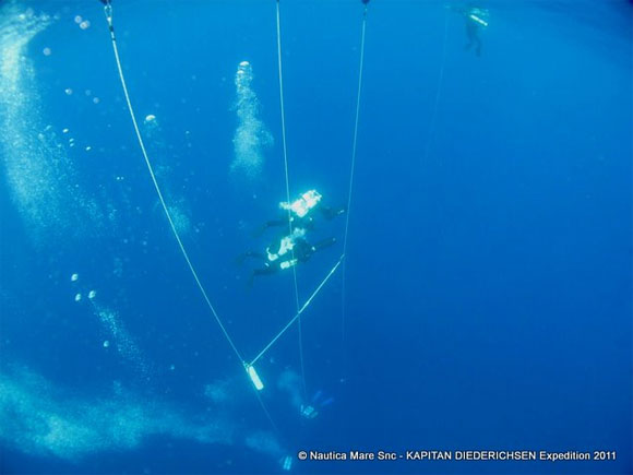 Durante l’impegnativa attività di rilievo, i componenti della spedizione, suddivisi in tre team e dotati di scooter subacquei, hanno svolto immersioni alla profondità massima di 66 metri per un tempo di fondo di circa 40 minuti utilizzando miscele ternarie contenenti elio. Le tecniche adottate e gli equipaggiamenti utilizzati, associati alle ottime condizioni meteo marine in superficie e la buona visibilità sul fondo, hanno consentito di raccogliere numerose immagini sia all’esterno del relitto che al suo interno, che hanno confermato così l’identità del relitto.