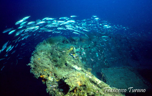 Planando a mezz’acqua prima di giungere in prossimità del fondo, vedremo gradualmente il trasformarsi dei tono blu/verdi del quadro generale dello scafo, visto dall’alto, in toni sempre più saturi e, alla luce del faro, scopriremo subito i primi incredibili colori. Cromatismi intensi e felici che, per quanto comuni a molti relitti e ricorrenti un po’ ovunque, sono sempre un biglietto da visita entusiasmante per un relitto. Parlo del colore di tutti quei piccoli pesciolini della famiglia dei serranidi che, con il loro delicatissimo rosa e l’eleganza delle loro forme, incorniciano quasi ogni tipo di struttura sommersa. La magia delle castagnole rosa si somma a quella di strutture dello scafo, come corrimano, alberi e bracci di gru, coperti a tappeto da tunicati e poriferi, in un tripudio di colori e forme bizzarre che nell’insieme ricorda la ricchezza di un mare tropicale…