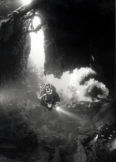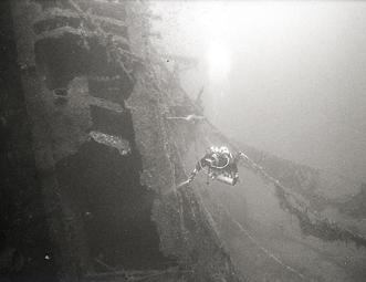 In questa prima immersione visitiamo la zona a poppa, la zona di prua la riserviamo all’immersione dell’indomani. Vincenzo ci fa subito vedere dove il siluro a colpito la nave, squarciando lo scafo che in quella zona appare bucato da parte a parte: una enorme galleria in cui si può tranquillamente entrare.