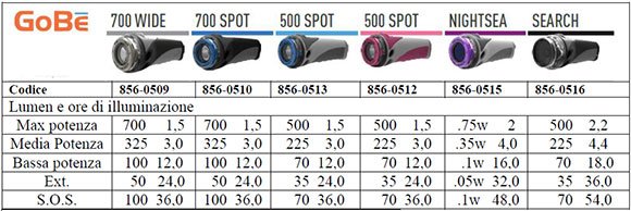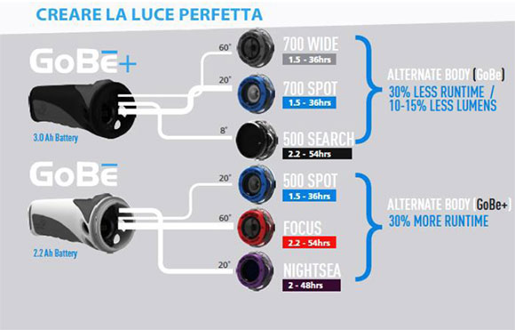 dà una luce che è strumento ideale per una vasta gamma di attività: dalle immersioni subacquee estreme, alle attività sull’acqua, alle avventure sulla terra, all’uso notturno sulle biciclette. GoBe è la perfetta attrezzatura che coniuga la già conosciuta robustezza e il design delle lampade SOLA con la