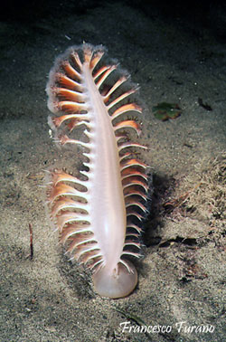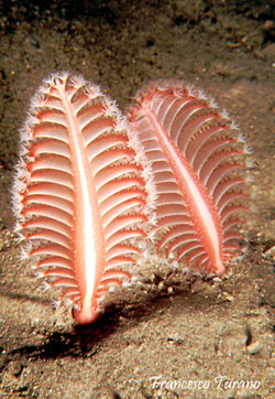 Se dovessi descrivere l’aspetto di quei celenterati marini volgarmente noti come pennatule o pennacchiere non esiterei a definirle “piume del mare” per via del loro aspetto, del tutto simile a una penna d’uccello (o una piuma di struzzo, per essere un pochino più precisi). Fissate al fondale in maniera non definitiva e capaci di movimenti molto lenti e graduali, le pennatule frequentano i fondali meno esplorati dai subacquei in genere, quelli che vengono definiti “tecnicamente” fondi mobili (costituiti da sedimenti di vario tipo e granulometria e comunque apparentemente monotoni se osservati con una certa superficialità). In Mediterraneo sono presenti due specie di pennatule: Pennatula rubra e Pennatula phosphorea. Non posso però non menzionare un altro pennatulaceo molto simile che, pur non essendo esattamente una pennatula (genere Pennatulidae), gli somiglia moltissimo e chiude il gruppo di questi insoliti celenterati; animali che, tutto sommato, si possono osservare negli stessi ambienti e sugli stessi fondali. Sto parlando del Pteroides spinosum, unico rappresentante del genere Pteroididae.
