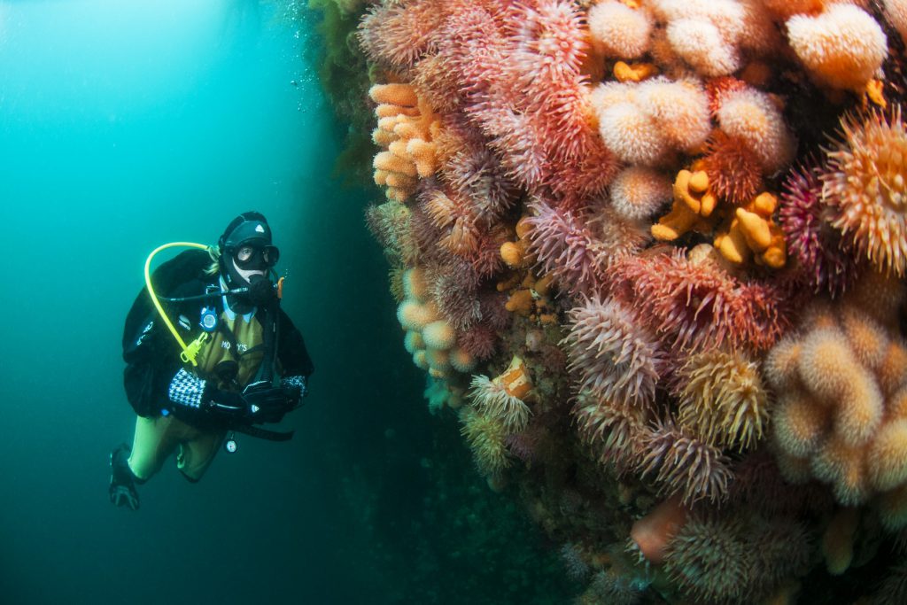 A metà giugno la foresta di kelp è verde e quasi senza incrostazioni. Nuotiamo lentamente su questo gigantesco salad bar, alla ricerca del canyon, dove scendiamo tra pareti coperte di alcionari, incontriamo un lompo colorato, cottidi mimetiizzati, enormi nudibranchi e banchi di sottili merluzzi gialli sospesi nella corrente. In fondo al canyon una scogliera coperta di kelp enorme. Il sole penetra incredibilmente oltre i 20 m di profondità. Torniamo nel canyon, con gli occhi e la macchina fotografica già pieni di belle immagini.