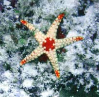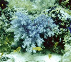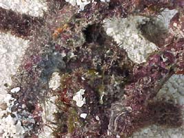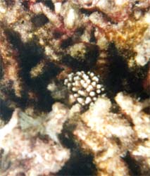Nonostante gli strani fenomeni già descritti di torbidità dell’acqua e di correnti "impazzite" la temperatura si era ristabilita sui valori standard (forse leggermente più bassi). Entro i primi metri ho notato numerosissime nuove piccole colonie della grandezza di un pugno di diversi tipi Acropore, che con i tessuti vivi e non ricoperti da alghe, risaltavano come fiori nell’omogeneità del colore che le circondava (nel centro della foto).
