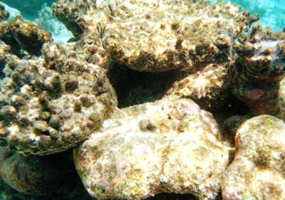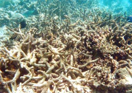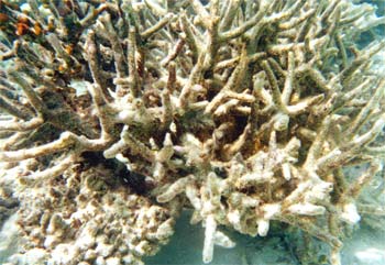Tutte le numerosissime specie di Acropore con struttura a ramo sottile o tubolare spesso erano addirittura crollate, ricoprendo ampie zone sulla sabbia. Tutte le costruzioni erano morte e degradate sia le strutture ad ombrello delle Acropore e delle Montipore che quelle a fungo o panettone delle Alveopore, o di qualsiasi altra forma o tipo. Assolutamente nulla era rimasto vivo.