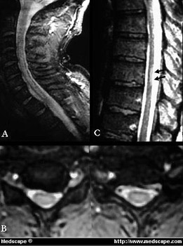 Figure 2. MRI showing spinal cord DCS (cervical and dorsal tract). Reprinted from the Journal of Magnetic Resonance Materials in Physics, Biology and Medicine.
