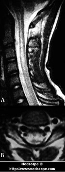 La risonanza magnetica nucleare (MRI) mostra malattia da decompressione del tratto cervicale e dorsale del midollo spinale