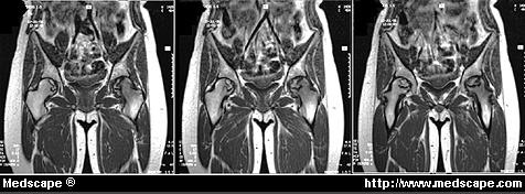 Figure 4. MRI showing juxta-articular avascular osteonecrosis of the hip. Reprinted with permission from the Virtual Hospital. La MRI mostra osteonecrosi avascolare vicino all’articolazione dell’anca.