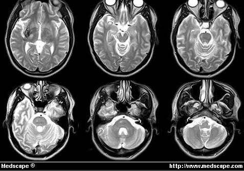 Figure 5. MRI demonstrating brain infarction and degeneration. Reprinted with Permission from Ray Ballinger, MD, PhD. (L’immagine con Risonanza Magnetica evidenzia infarto cerebrale e degenerazione)
