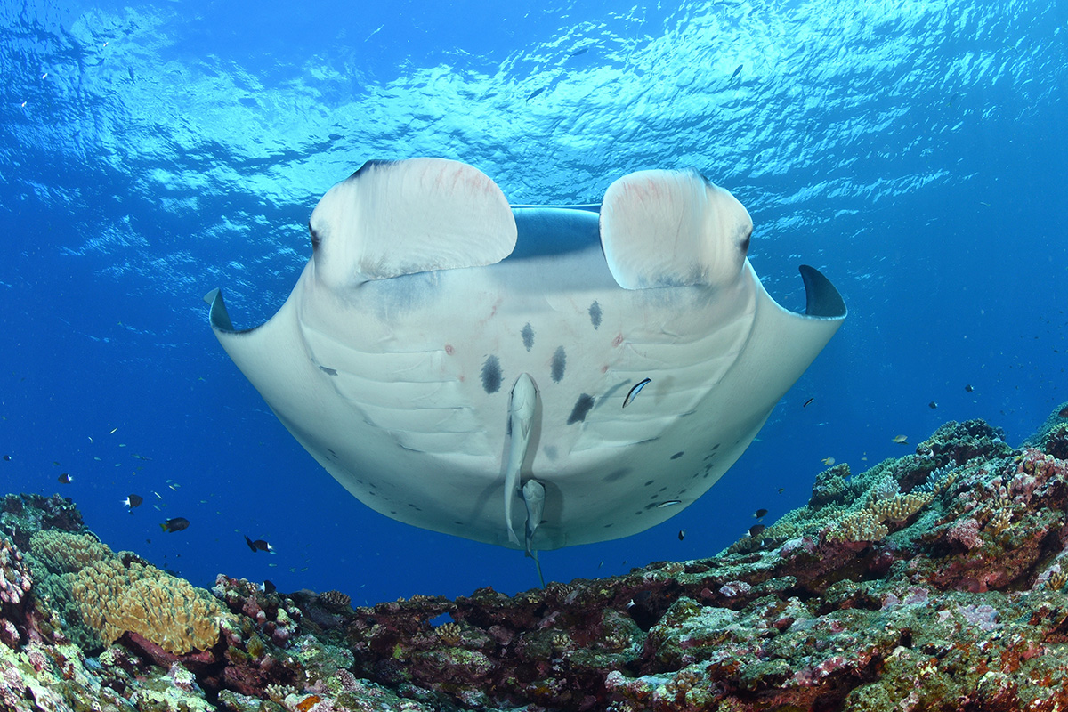 Fuori dall’area del Tiger Zoo non è improbabile incontrare individui di mante oceaniche, le cugine maggiori delle mante del reef che chi ama le Maldive conosce bene dalle visite alle cleaning station, imperdibili in qualsiasi stagione dell’anno. Questi magnifici filtratori durante il monsone invernale si aggregano nel profondo sud, concedendosi all’osservazione durante il maestoso incedere.