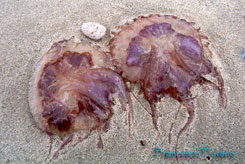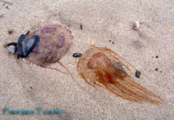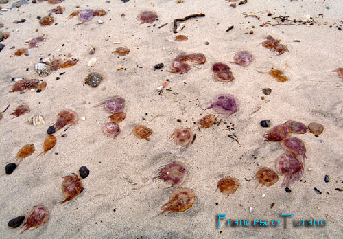 Ma l’immersione volge al termine e, tra cento individui di un angolo di superficie, riemergo a stento, con ancora addosso qualche medusa penzolante, che una volta fuor d’acqua è privata della sua eleganza e del suo straordinario fascino. Osservare le meduse spiaggiate e sballottate dalle onde quasi dispiace, ma è il loro triste destino, è una fase della loro esistenza!