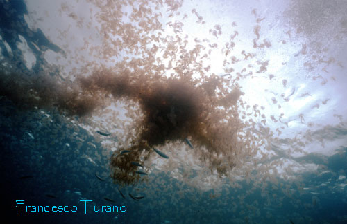 Stamani il mare aveva sfumature insolite e il sole giocava a nascondino dietro le ultime nubi di una perturbazione ormai agli sgoccioli. L’alternanza della luce metteva a tratti in evidenza delle fasce violacee in superficie, che non lasciavano molti dubbi sulla presenza di una nuova massiccia invasione di meduse luminose (così dette perchè lievemente bioluminescenti nell’oscurità). Una bava di vento lambiva ancora l’ingresso dello stretto e, dalla spiaggia di Scilla, non si capiva bene se l’acqua fosse limpida o meno. Solo immergendosi sarebbe stato possibile scoprirlo. Indossata la mia vecchia muta stagna per affrontare i rigori di una stagione, la primavera subacquea, sempre molto fredda nonostante il tepore del sole del sud, bombole in spalla, scivolo in acqua con in mano l’attrezzatura fotografica; ma mi rendo presto conto di aver lasciato i guanti dentro una scarpetta delle pinne, alloggiate sotto un braccio e pronte ad essere calzate soltanto una volta in mare. Per evitare sorprese “ustionanti”, prima di allontanarmi da riva metto pinne e guanti e, nuotando sul dorso, inizio un percorso in superficie verso la verticale del punto d’immersione. All’improvviso mi ritrovo avvolto da una densa coltre gelatinosa, talmente fitta da non consentirmi di infilare la testa sotto il pelo dell’acqua…