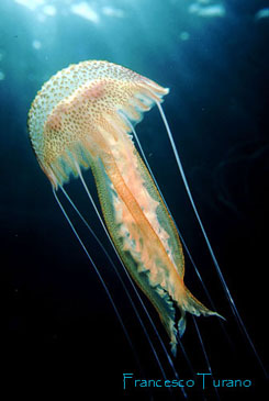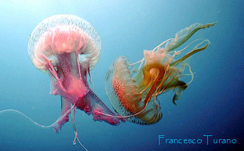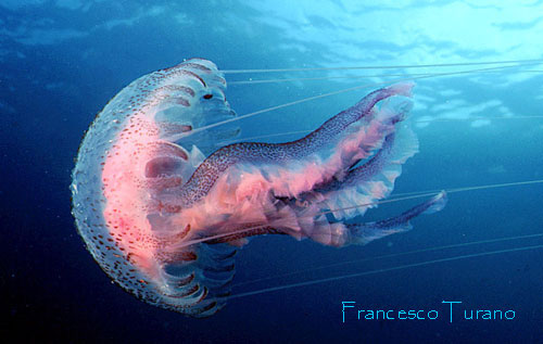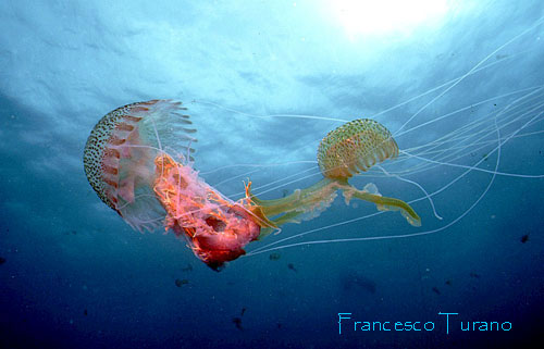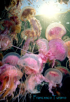 Osservare queste straordinarie creature significa pensare a quanto è stata grande la Natura: sono esseri meravigliosi, fatti quasi completamente di acqua, ma con forme, colori e movimenti talmente aggraziati da stupire sempre e non stancare mai. Subisco il fascino delle meduse da quando vado sott’acqua, quindi da sempre, e non mi stanco mai ne di osservarle ne di fotografarle. Guardo le meduse dal basso verso l’alto, dal fondo verso la superficie, con i raggi del sole che filtrano dal cielo, sfondano la superficie del mare e attraversano i corpi di gelatina, mettendo in risalto la sagoma trasparente di una struttura unica nel regno animale. Ce ne sono senza fine e la mia mente non riesce a comprendere come questi animali possano vivere così addossati gli uni sugli altri. Mi vien da pensare al traffico di un centro urbano ma poi mi ricordo che le meduse non “vedono” e probabilmente non percepiscono quanto io, essere umano, sto immaginando. Le più grandi sono rosa o fucsia, con diverse sfumaure intermedie; le mediane sono bruno giallastre; le più piccole brune o bianche. E ce ne sono di talmente piccole che non hai scampo quando avanzi pinneggiando nell’elemento liquido. Te le ritrovi addosso, dappertutto. E quelle adulte hanno tentacoli lunghissimi, tanto da creare una rete micidiale dove, se passi, ci resti…