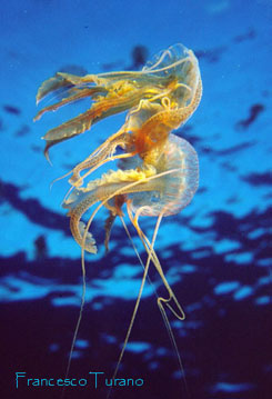 Credo che approfitterò di questa nuova stagione primaverile all’insegna delle meduse per tuffarmi più volte nel mare dello stretto, tra Scilla e Cariddi; qui le correnti convogliano grandi popolazioni di questi celenterati vaganti nel Mediterraneo, e per godere di uno dei più straordinari fenomeni naturali, alterati o no dall’uomo è ancora da vedersi, basta coprirsi adeguatamente il corpo con una buona muta e immergersi, “intrufolarsi” nel gruppo appena sotto il pelo dell’acqua. Con una fotocamera, con una videocamera o con i soli occhi, le emozioni e le sensazioni saranno comunque molto forti.