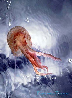 Cerco invano di farmi spazio con le braccia per ricavare il minimo spazio necessario scendere giù almeno qualche metro ma, nonostante gli sforzi, supero la barriera con non poche difficoltà, saggiando per forza di cose le cellule urticanti delle meduse nell’unico spazio scoperto che un subacqueo può avere: i dintorni della bocca e quel poco spazio tra maschera e cappuccio della muta. Finalmente sott’acqua, raggiungo acque aperte libere dal sovraffollamento e mi giro verso la superficie; lo spettacolo è incredibile: masse di milioni di individui sono addensati a formare colonie così fitte da non lasciar passare la luce. Ci sono meduse d’ogni dimensione, ma tutte della stessa specie: Pelagia noctiluca. Quando si osservano le meduse, specie quelle urticanti, non si deve pensare mai al dolore che si prova quando si entra in contatto con gli cnidoblasti, le temibili cellule responsabili dei danni all’epidermide umana…
