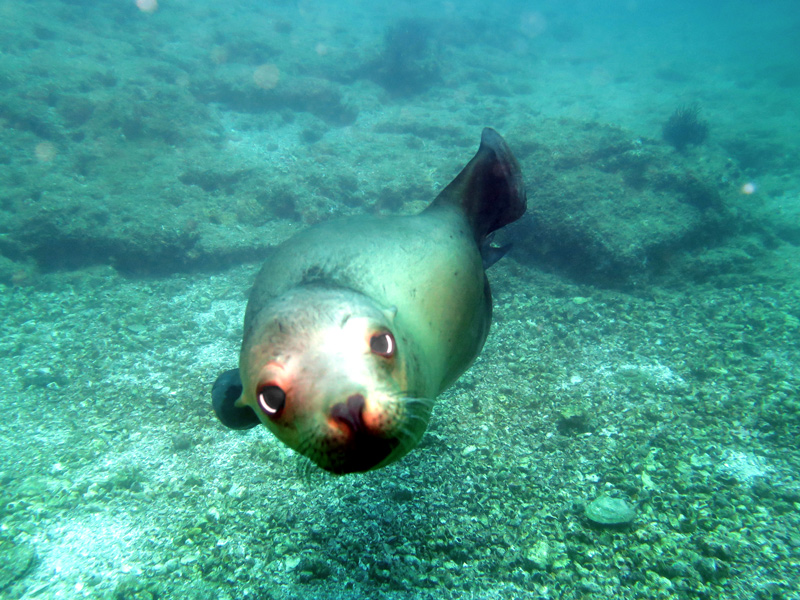 Domani si va sott’acqua con le bombole a La Reina, località Isla Cerralvo. Fondale sfolgorante di vita autoctona, dalle pastinache tonde di Cortez (Urobatis Maculatus) alle torpedini ocellate (Diplobatis Ommata), il carosello dei leoni marini è un vero manicomio. Ti mordono le pinne, ti vengono in faccia, sbattono il muso sugli scafandri delle macchine fotografiche e, a un certo punto, ti accorgi che qualcosa o qualcuno armeggia alle tue spalle. È il leone marino, il più audace e burlone di tutti, che cerca di sfilarti il cappuccio dalla testa. Incredibile.