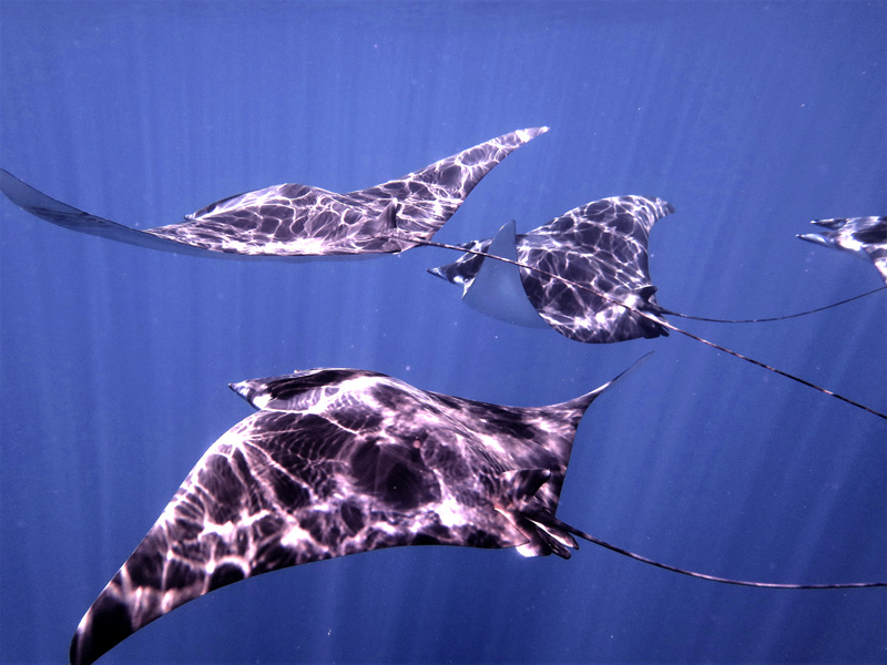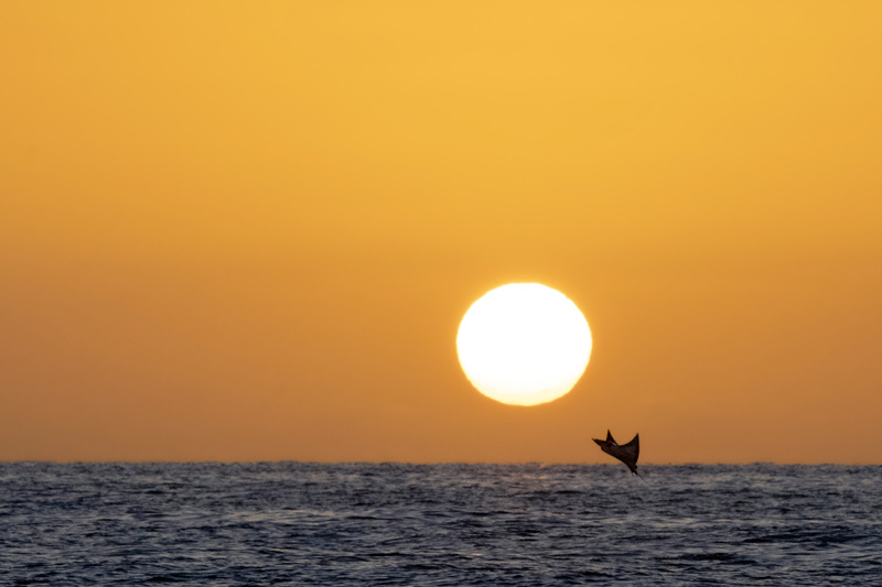 Il terzo giorno sveglia alle tre e mezza di mattina. L’alba sale alle cinque e venticinque e dobbiamo essere sul posto per assistere al sorgere del sole. Tutti dritti, attenti, con le macchine fotografiche impostate. Teleobiettivi potentissimi. È questione di fortuna, di concentrazione. Bisogna stare immobili, in attesa. Eccole, una, due, tre. Le mobule saltano, salutano il sole che nasce. Sono pochi secondi, preziosi, unici, per catturare l’immagine del volo della mobula agli albori del nuovo giorno. Che spettacolo.