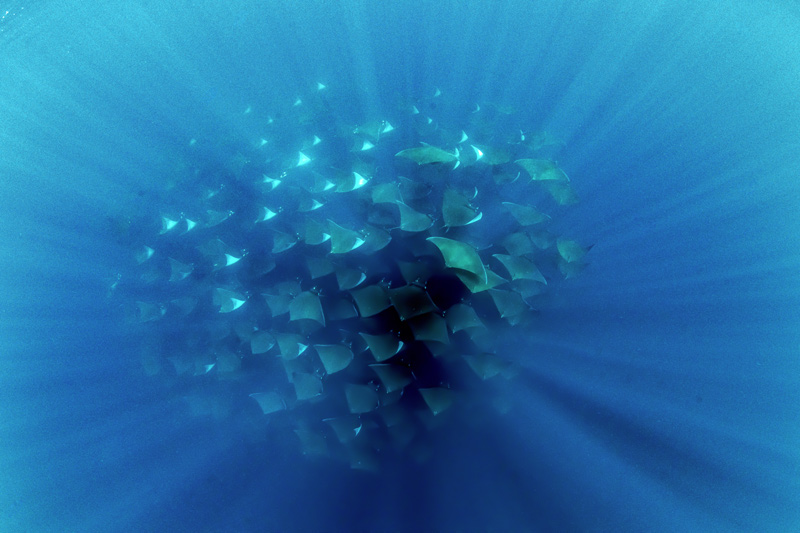 Località La Ventana, Baja California Sur. Si parte la mattina alle sei, dopo un’alzataccia antelucana. Si sale in barca, alla ricerca. Le mobule si palesano a pelo d’acqua, precedute dagli esemplari più esuberanti, che si lanciano come razzi verso il cielo. Ricadono fragorose, spanciano sulla superficie del mare come tuffatrici maldestre. Sfidano la gravità con tutto l’impeto primitivo di una forza primaria, primordiale. Si entra in acqua. Centinaia di esemplari nuotano in gruppo. Corrono, sfilano, si riuniscono in palle enormi e informi. Che spettacolo.