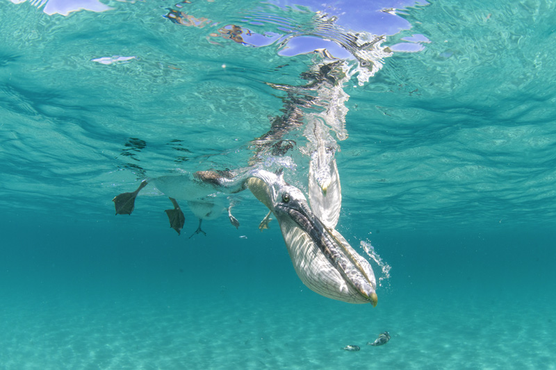 La barca fa una sosta in una baia luminescente. Le fregate pattugliano dall’alto in attesa di catturare la preda. I pellicani si precipitano, si fiondano come furie, affondano il becco per rubare le sardine lanciate dai pescatori. Le macchine fotografiche sono tutte lì, sommerse, a cercare lo scatto miracoloso, così, alla cieca.