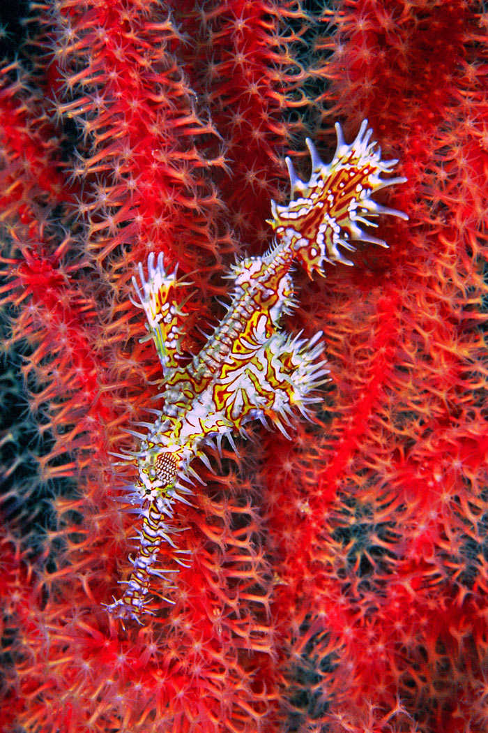 In queste magiche acque si trovano animali stupefacenti, tra i quali i pesci fantasma arlecchino. Fanno parte della famiglia Solenostomidae, composta dall’unico genere Solenostomus, che comprende 5 specie di pesci d’acqua salata, dell’ordine dei Syngnathiformes; parenti stretti dei cavallucci marini. Questi pesci sono caratterizzati da coloratissimi mantelli di infinite nouances. Per riprese di questi Signatidi è opportuno l’impiego di ottiche macro, con focali tra i 50 e i 100 mm.