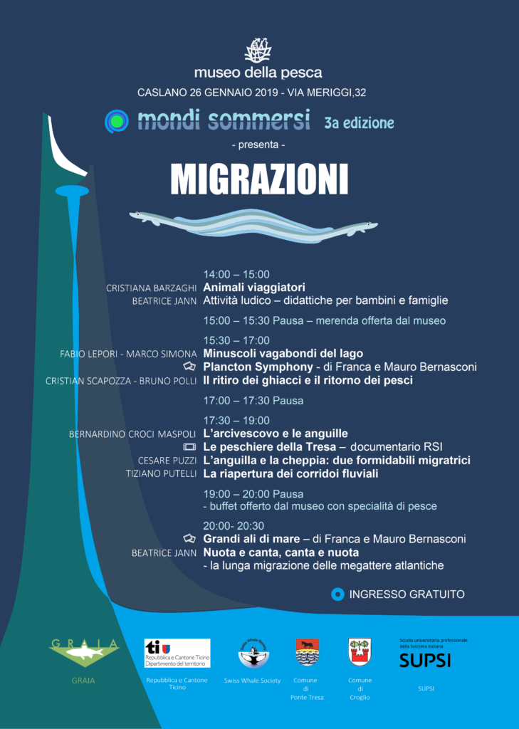 I vari relatori ci parleranno delle migrazioni del plancton all’interno della colonna d’acqua del lago Ceresio e della colonizzazione dei pesci dopo l’ultima glaciazione. Si parlerà di migrazione delle anguille e quindi anche di peschiere della Tresa, e delle le scale di monta per i pesci. L’ultima parte tratterà la migrazione delle megattere nell’ Oceano Atlantico.