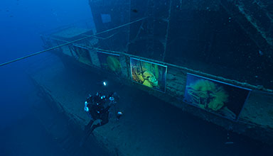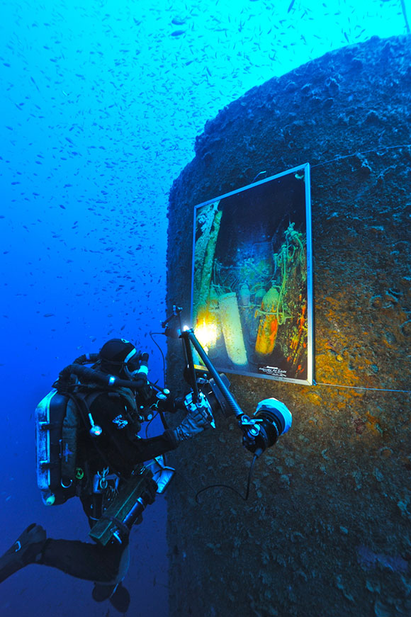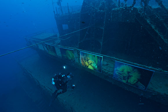 Viene sistemata una cima di discesa per Patrizia e, vicino a questa, il nastro di prova. Nel frattempo proseguono le riprese della mostra e vengono scattate ulteriori fotografie. Il colpo d’occhio è notevole già durante la discesa ma, una volta arrivati sul relitto, le fotografie si stagliano in tutta la loro bellezza. A far da cornice i banchi di pesce che continuano ad animare il relitto con i loro spostamenti in massa e gli zerri, nel periodo degli amori, che sfoggiano coloratissime livree. Come sottofondo si aggiungono poi dei delfini in lontananza che concedono ad alcuni fortunati l’ascolto dei loro versi.