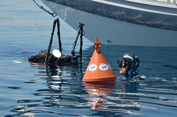 La notizia intanto arriva in superficie, Patrizia sta risalendo. Gli sguardi sono fissi sulla boa attaccata alla cima di discesa e il silenzio cala per la seconda volta. Poco dopo Patrizia emerge con la sua muta nera e azzurra, e il sorriso stampato sul suo volto non lascia dubbi sulla buona riuscita dell’immersione. Scatta l’applauso, la mostra è ufficialmente aperta!