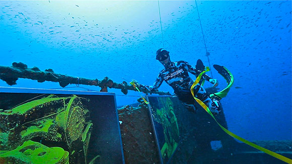 Una volta arrivati sul punto si contano due gommoni della Guardia Costiera, un gommone della Guardia di Finanza (con tanto di elicottero), i due gommoni dei diving e un’altra imbarcazione d’appoggio. L’atmosfera che si viene a creare è del tutto simile a quella dei tentativi dei record. I subacquei d’assistenza e i video-operatori sono pronti sul fondo e lungo la cima di discesa, un medico è presente a bordo per motivi di sicurezza, le telecamere e le macchine fotografiche dalla superficie lavorano a pieno ritmo e, con l’avvicinarsi del momento, cala il silenzio assoluto. Patrizia si prende i suoi minuti di concentrazione e poi con un movimento semplice ed elegante sparisce sott’acqua. Effettua la discesa con tutta la tranquillità di una grande esperta e, arrivata sul relitto, taglia con delicatezza il nastro color giallo acceso scelto per l’occasione. Un ultimo saluto ai subacquei presenti sul fondo e comincia altrettanto tranquillamente la sua risalita dalle profondità marine.
