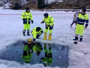 Qui in montagna, si è rafforzata la voglia di stare assieme e la sfida di preparare tutto, come sono abituati a fare. La logistica è stata impegnativa sotto tutti gli aspetti .Al Mortirolo, la mancanza di neve necessaria a ricoprire la strada di accesso al rifugio, ha comportato un doppio transfert con jepp fuoristrada e motoslitta, per tutti i partecipanti, le bombole e tutto il resto del materiale necessario ad effettuare in sicurezza il campo di immersione comprendente le due motoseghe , cassoni con varie decine di metri di cima, moschettoni vari, chiodi da ghiaccio, teli ; e questo sia all’andata che al ritorno !!! Una sfacchinata immane !